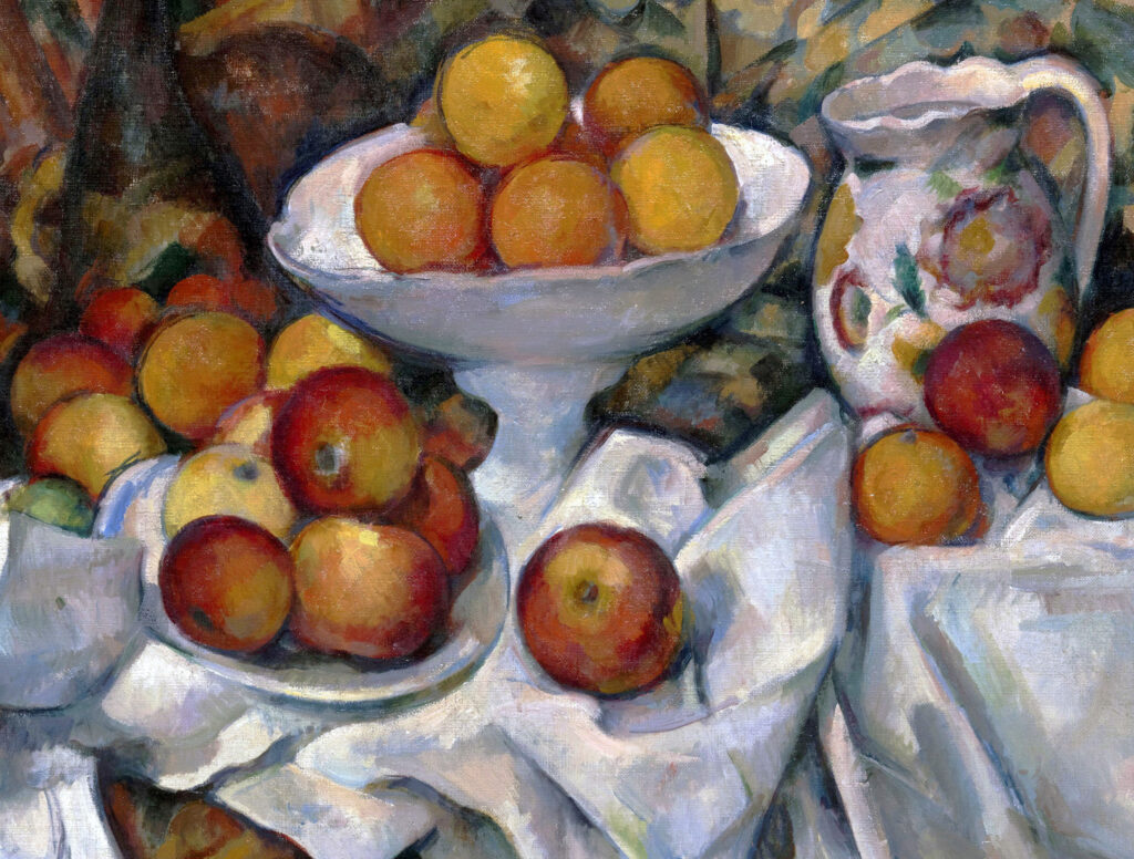 特徴: セザンヌの静物画の最高傑作の一つ。テーブルが斜めに歪んでいたり、複数の角度から見たリンゴが混在していたりする。