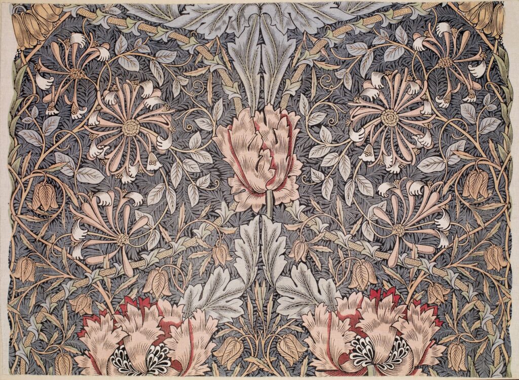 モリスの代表作《Honeysuckle(1876)》のように、植物が複雑に絡み合う自然モチーフは、規則正しすぎない「ゆらぎ」を持っています。