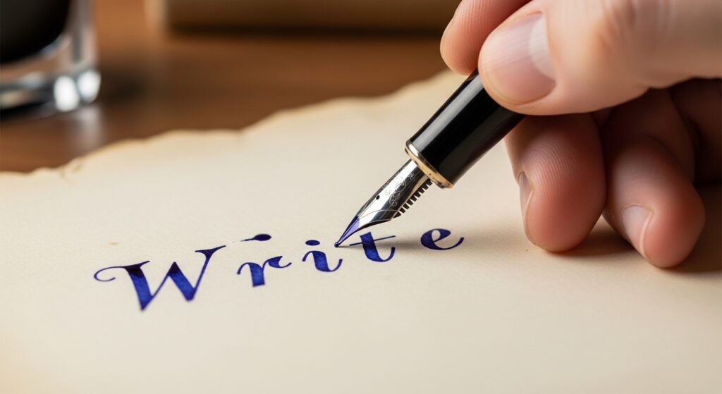 - デジタルフォントではなく、万年筆で紙に文字を綴る。