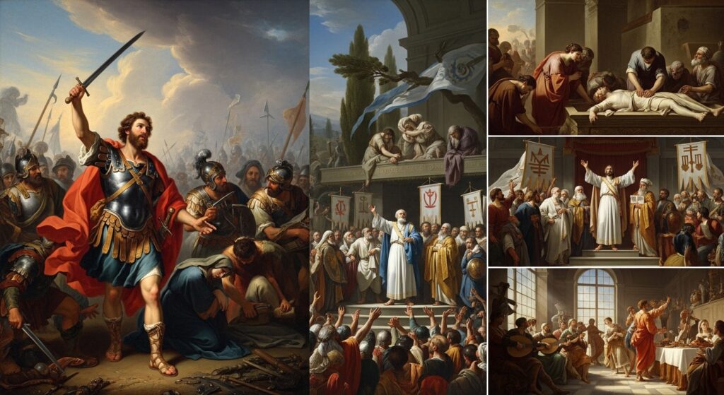 物語は、異民族の支配に苦しむイスラエルの民が、指導者ユダ・マカバイのもとで立ち上がるところから始まります。
