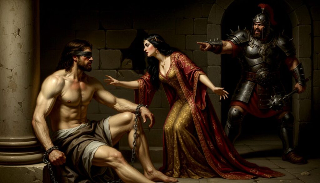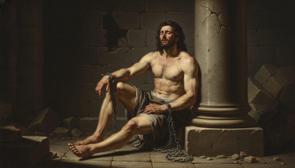 ダリラの裏切りによって無力化された後、敵であるペリシテ人に捕らえられ、見せしめとして両目を潰されてしまいます。これは彼の「外的な力の喪失」と同時に、「内面的な覚醒」への転機でもあります。