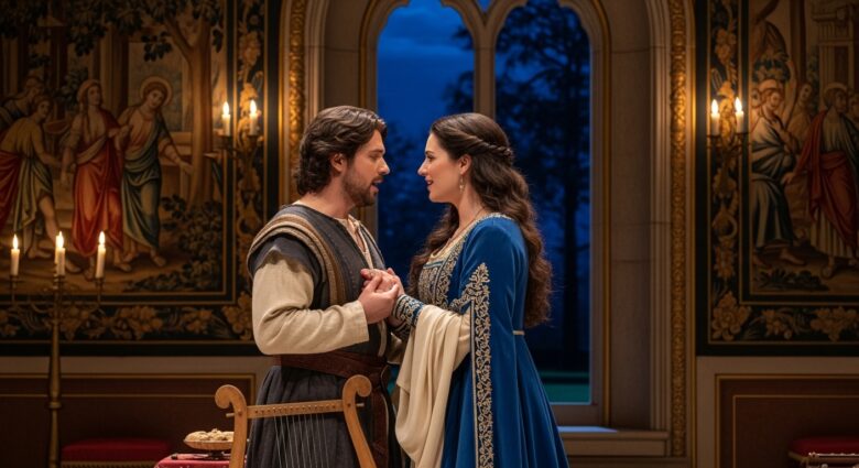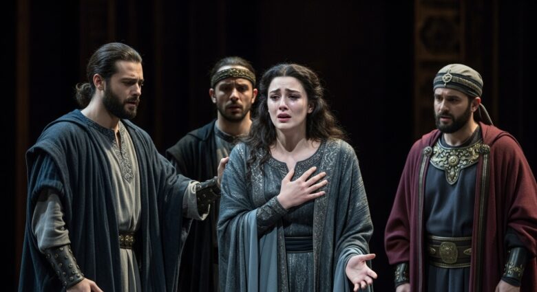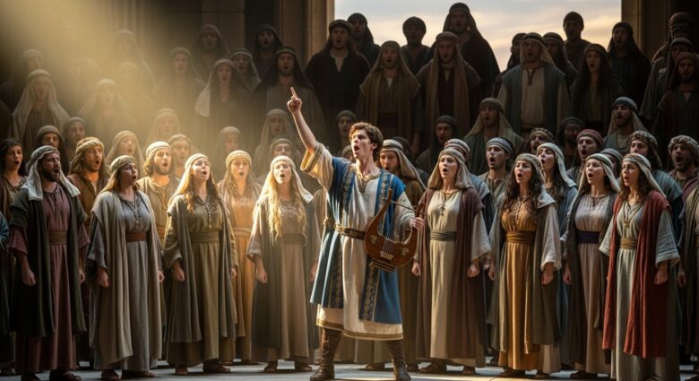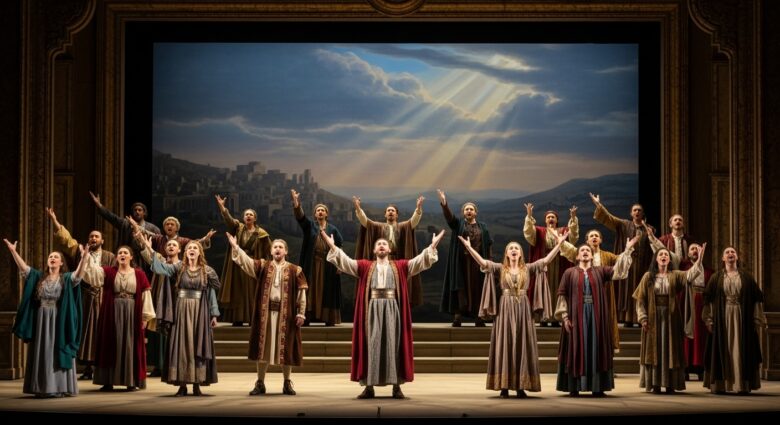 物語は圧倒的な合唱で幕を開けます。神への感謝と勝利の喜びを歌い上げる大合唱は、祝祭の花火のように華やか。