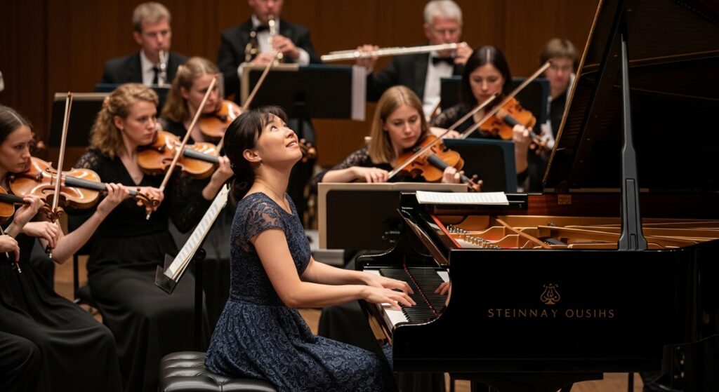 ロンド形式で進むこの終楽章は、躍動するリズムときらめく旋律に満ちあふれています。ピアノは生き生きと跳ね、管弦楽と親密に語り合いながら、前へ前へと推進していく愉しさと言ったら……。