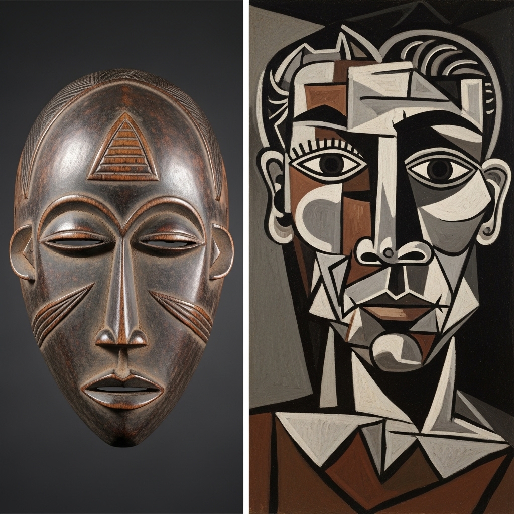 1900年代初頭、ピカソは伝統的な西洋美術の写実技法から離れ、アフリカのマスクや彫刻が持つ力強い造形に衝撃を受け、それを自己の作品に取り入れたのでした。